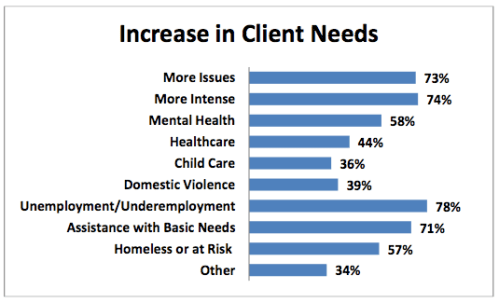 Agencies most commonly said they are seeing more unemployed clients (73%). More than 4 in 10 agencies indicated they are seeing more clients who are unfamiliar with the social service sector (48%), more clients without healthcare insurance (47%), more middle class clients (46%), more immigrants (44%), and more families (42%).
