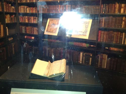 A library (viewed from behind a glass window) has volumes that are hundreds of years old, and appear to be in current use — looks like bright pink and yellow Post-It markers attached to them! The oldest book (above), on display in the treasure room crypt when we were there, is the first translation of Erasmus, a Dutch priest, teacher and theologian who died in 1536.
