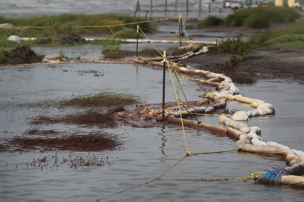 PORT FOURCHON, LA – JULY 7: Oil coats plants and oil absorbent material as high winds and waves caused the cancellation of cleanup operations on the beach on July 7, 2010 in Port Fourchon, Louisiana. Foul weather continues to hamper oil cleanup operations on parts of the gulf coast. Workers are hoping to get back to work soon to help contain the Deepwater Horizon spill which has sent millions of gallons of oil into the Gulf since the April 20 explosion on the drilling platform.