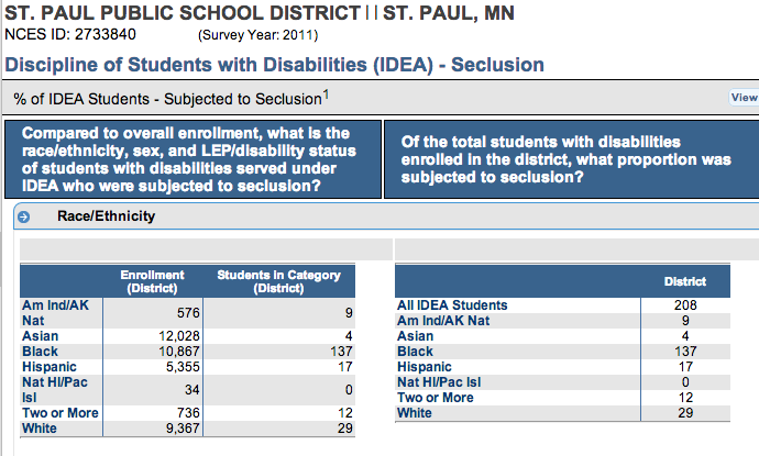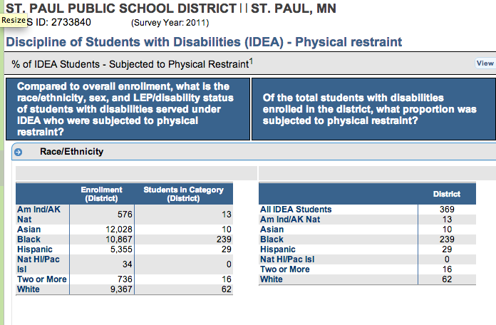 St. Paul reported to the Office of Civil Rights that 369 students with disabilities were subjected to physical restraint in the 2011 school year, and 208 were subjected to seclusion. The district did not report any physical restraint or seclusion of non-disabled students. Most of the students subject to physical restraint or exclusion were black students. The tables below are generated from the federal Office of Civil Rights data.