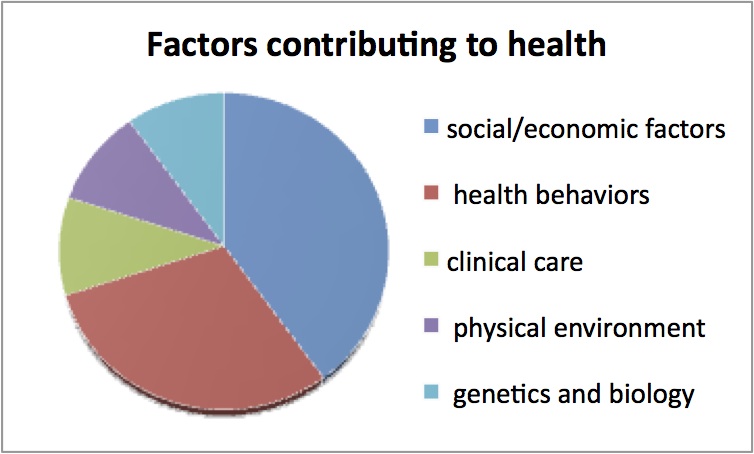 Public health focuses on much more than epidemics and vaccinations in the 21st century. Ehlinger pointed out that social and economic factors contribute more to health than clinical care, genetics, or even individual behavior. Looking at what creates health, the breakdown is:
