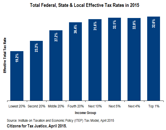 First, here’s a graphic showing the amount of income that each group pays in taxes. If you’re in the lowest income group, you pay 19.2 percent of your income in taxes. If you’re in the middle group, you pay 27.2 percent. If you’re in the top one percent, you pay 32.6 percent.