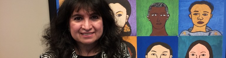Rose Santos, LEAP principal, with self-portraits created by LEAP students.