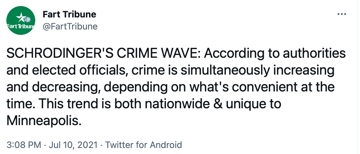 - Vox: “Murders are up. Crime is not. What’s going on?” 7/21/2021