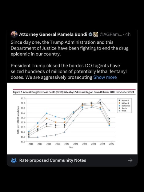 For a more humorous insight–grimly humorous, but still, laughing at tyrants is good for us and them–here’s Attorney General Pam Bondi’s recent post on X [below] celebrating a big reduction in drug overdose deaths. Just one problem, which led her to quickly remove the post: the reduction took place entirely in the Biden administration. The chart she posted ends in October 2024.