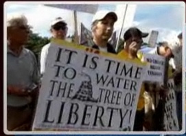 The man is carrying a sign that says, “It Is Time to Water the Tree of Liberty.” That’s a reference to a Thomas Jefferson quote: “The tree of liberty must be refreshed from time to time, with the blood of patriots and tyrants.” It was a favorite slogan of Oklahoma City bomber Timothy McVeigh, who was wearing a T-shirt when he was arrested with a picture of Lincoln on the front and a tree dripping with blood on the back.
